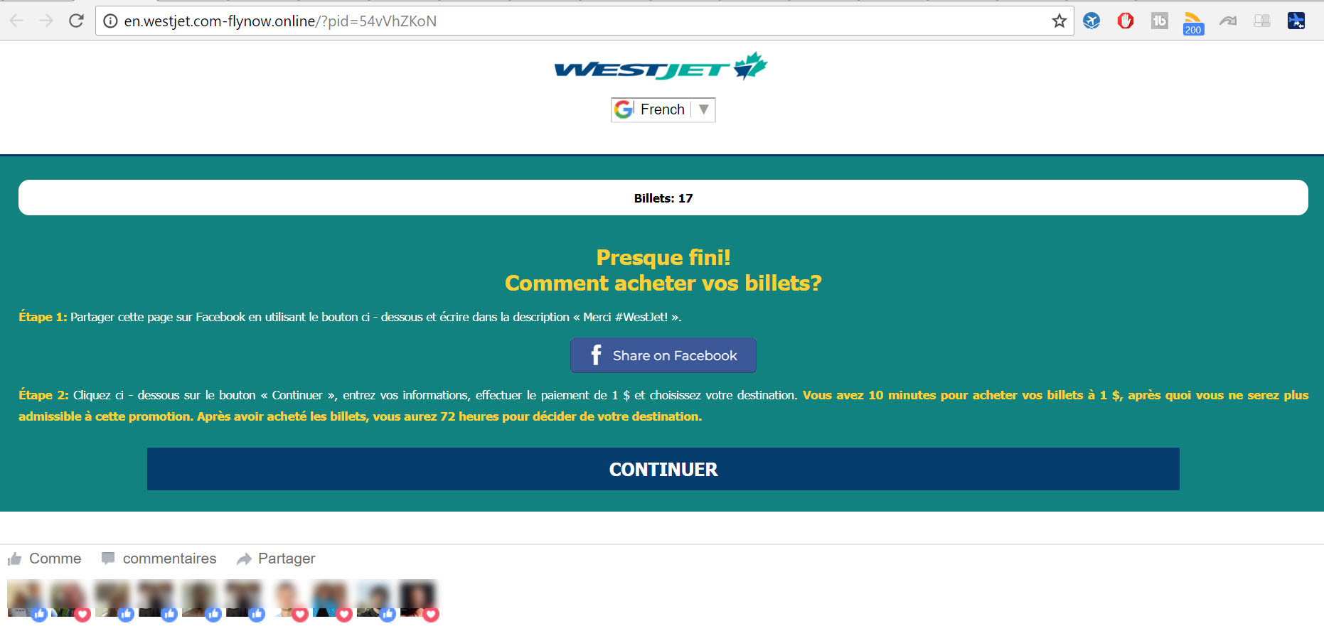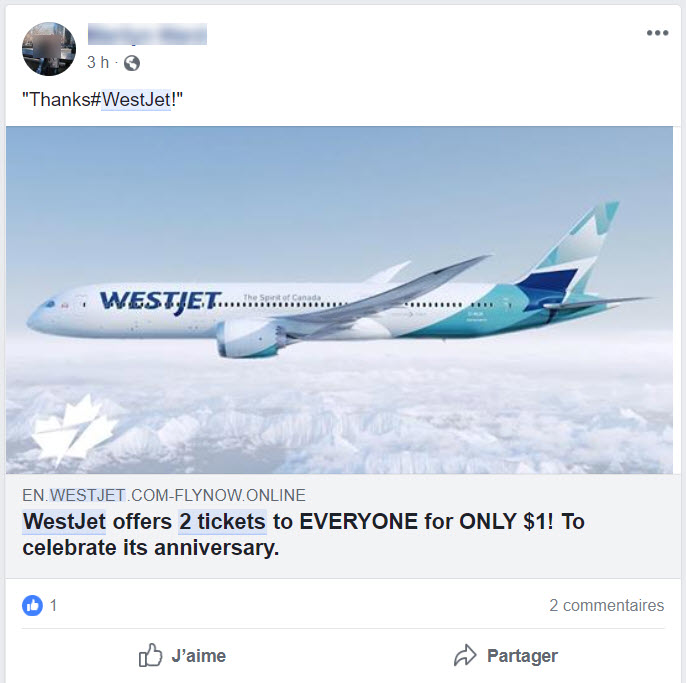 Le 1er juillet, j'ai vu passer sur Facebook une fausse promotion impliquant 2 billets de WestJet à seulement 1$, une offre de célébration d’anniversaire de la compagnie. Mais il s'agit d'une fraude et c'était trop beau pour être vrai.
