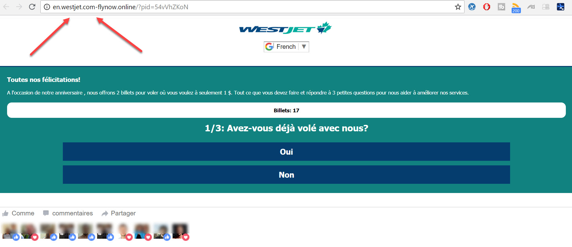 Et bien oui malheureusement, l'offre en question est une fraude mais elle bien déguisée car lorsque l'on clic sur celle-ci, elle vous dirige sur un page qui ressemble beaucoup à celle de Westjet avec son logo, même l'adresse du site semble bonne.