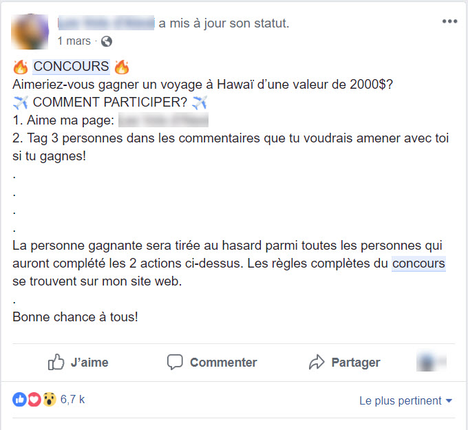 De faux concours se baladent aussi sur Facebook comme par exemple; gagnez 2000$ en voyage pour tel endroit, aimez notre page puis taguez vos amis(es).