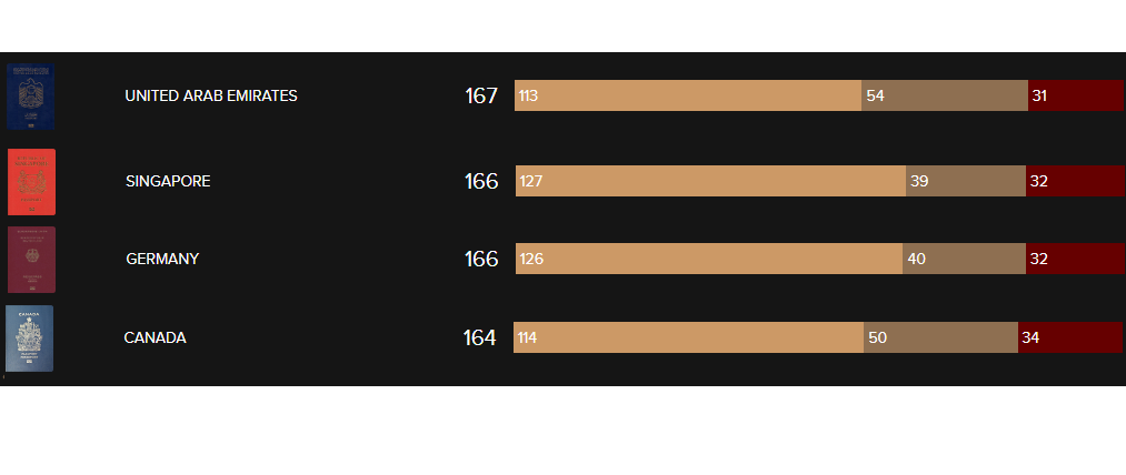Le passeport Singapourien reste tout de même le grand gagnant pour le nombre de pays accessibles sans aucun visa, celui-ci obtient le nombre de 127 pays suivi de l’Allemagne, Danemark, Suède et la Finlande avec 126 pays. Le Canada est loin derrière dans cette catégorie avec un accès à 114 pays sans visa.