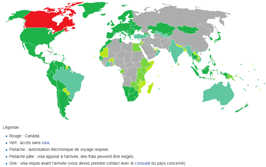 Vous pouvez consulter la liste des pays qui sont accessibles sans visa, avec visa à l’arrivée ou bien visa avant de partir pour les détenteurs d’un passeport Canadien: